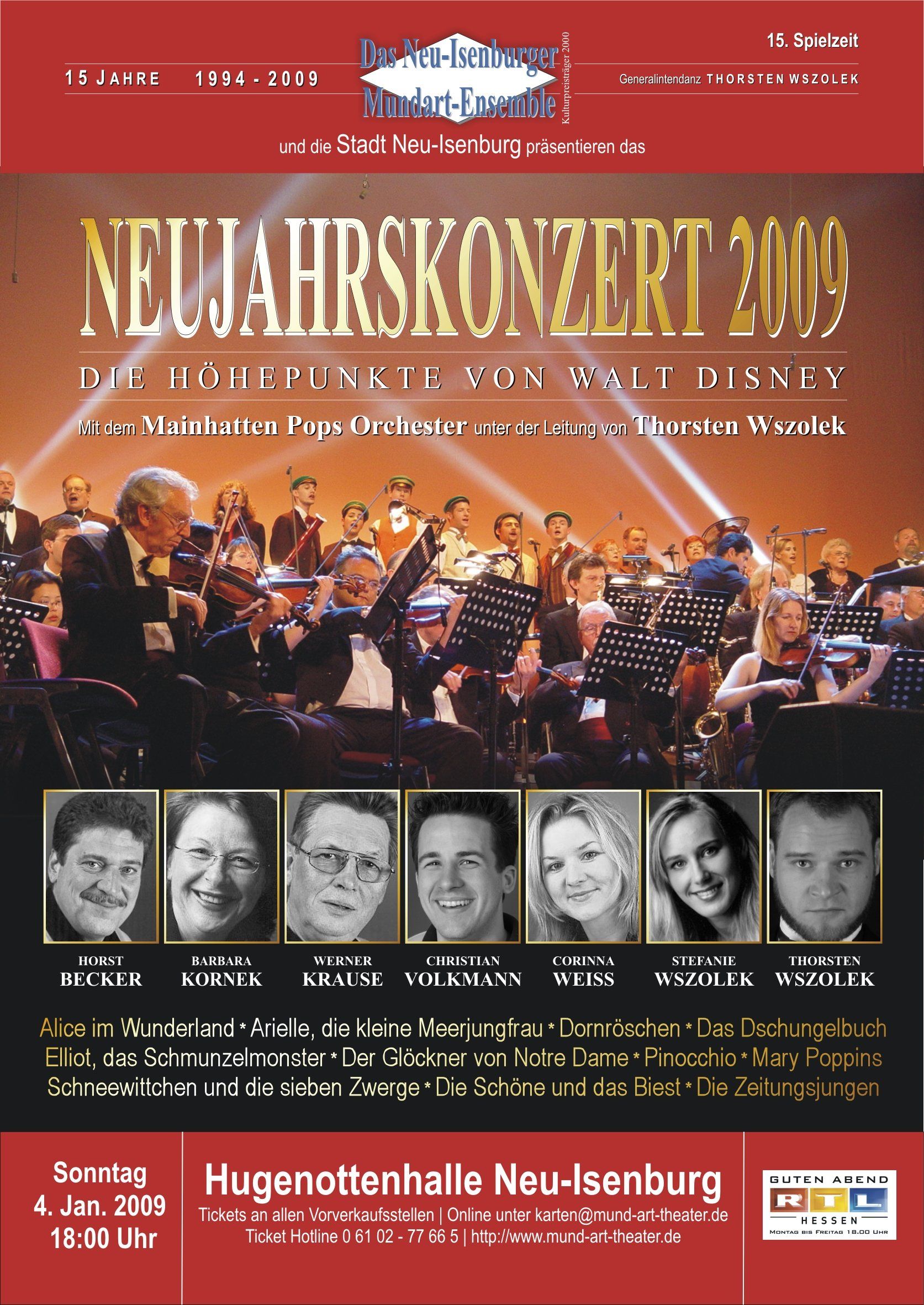 Erstmals steht das NEUJAHRSKONZERT unter einem Motto: "Die Höhepunkte von Walt Disney". Beliebte Melodien aus SCHNEEWITTCHEN UND DIE SIEBEN ZWERGE, PINOCCHIO, MARY POPPINS oder DIE SCHÖNE UND DAS BIEST verzaubern das Publikum der Hugenottenhalle.