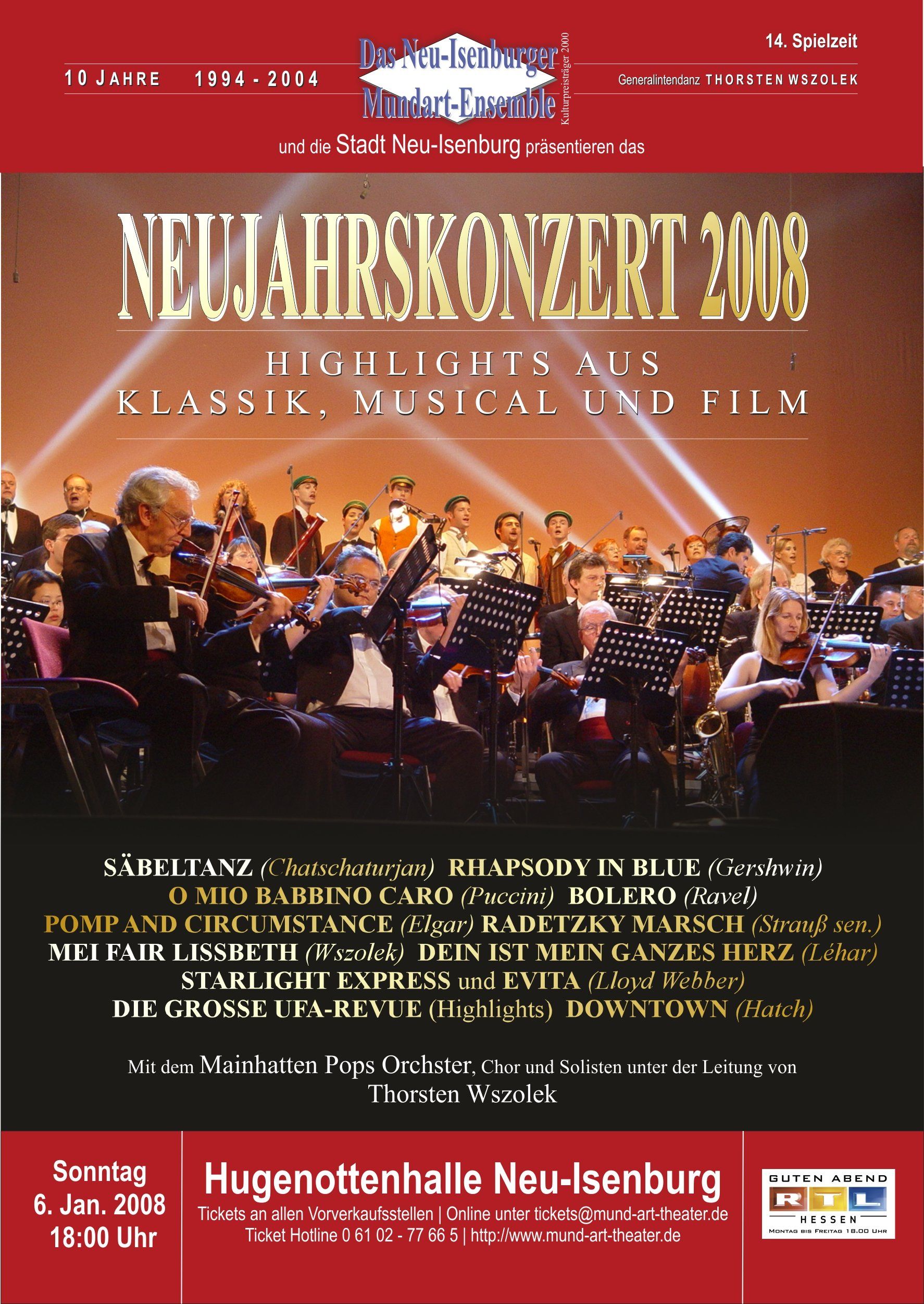 Das NEUJAHRSKONZERT 2008 wird erstmals auch von Thorsten Wszolek moderiert, der sein Publikum gewohnt im Sturm erobert und bis zum heutigen Tage der Protagonist aller Konzerte bleibt. Höhepunkt des 2008er Jahresauftakts sind "Rhapsody in Blue" (Gershwin) und "Boléro" (Ravel), den Wszolek dem Publikum vorab detailliert erklärt.