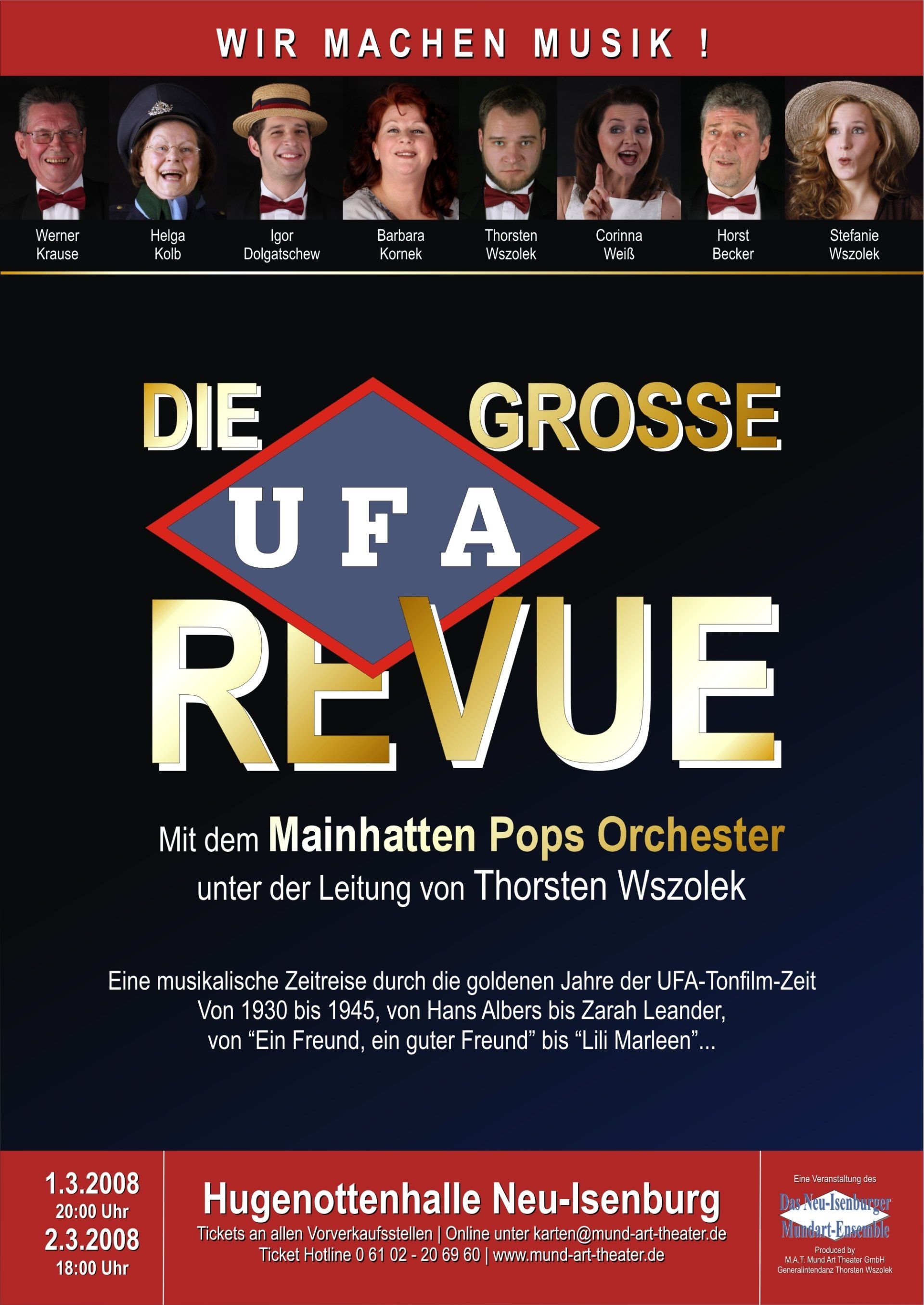 Nach dem überragenden Erfolg mit DIE GROSSE UFA-REVUE, einer musikalischen Zeitreise von 1930 bis 1945, am Muttertag 2007 im a2 in Weinheim, präsentiert das Mund Art Theater die Show im März 2008 an zwei Tagen in der Hugenottenhalle.