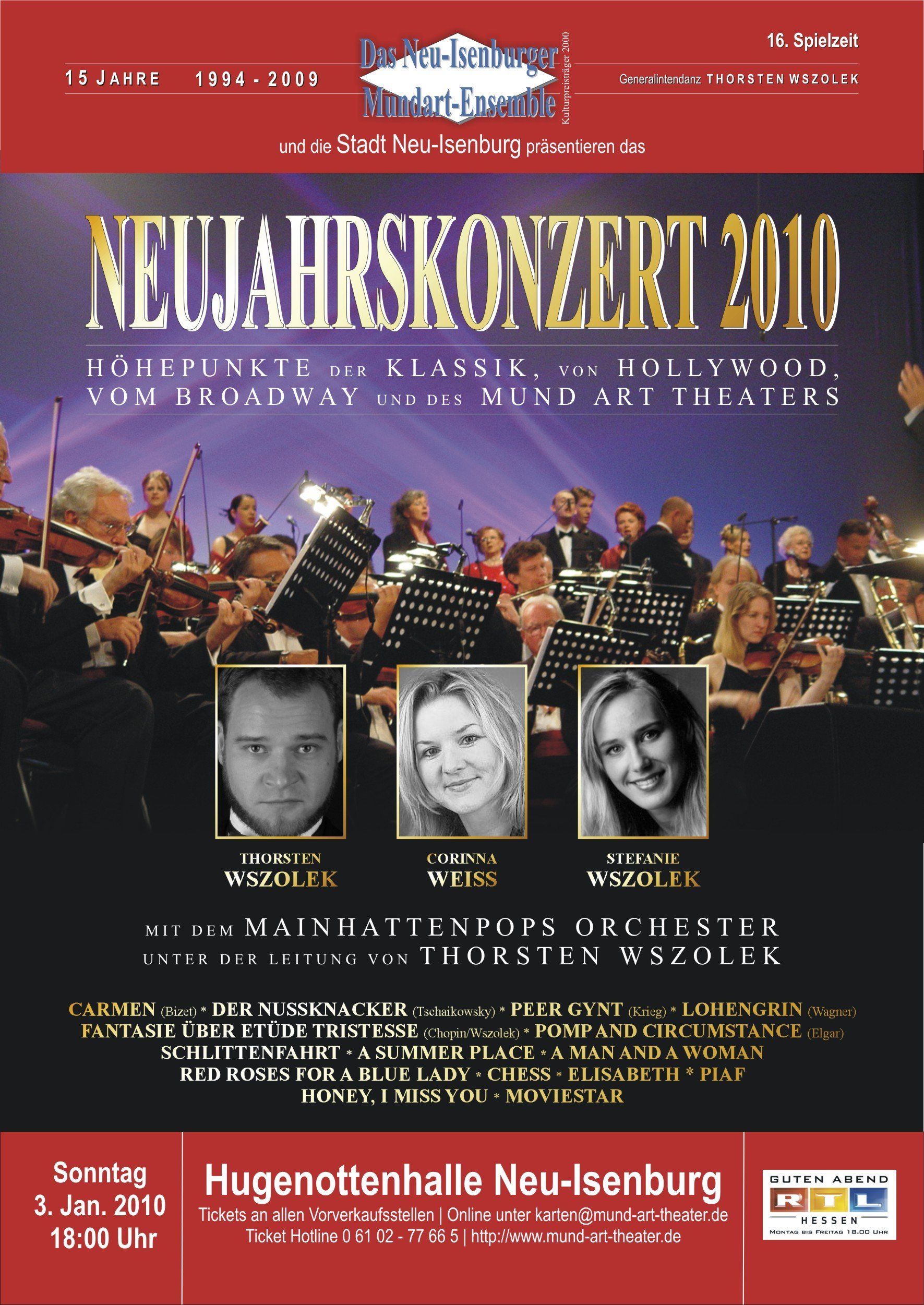 Im NEUJAHRSKONZERT 2010 werden im ersten Teil anlässlich 15 Jahre M.A.T. die klassischen Höhepunkte aller vergangenen NEUJAHRSKONZERTE dargeboten. Im zweiten, dem unterhaltsamen Teil, bilden Thorsten Wszolek's "Honey" und Corinna Weiß' und Stefanie Wszolek's Duett "Ich kann ihn versteh'n" aus dem Musical CHESS die Highlights.