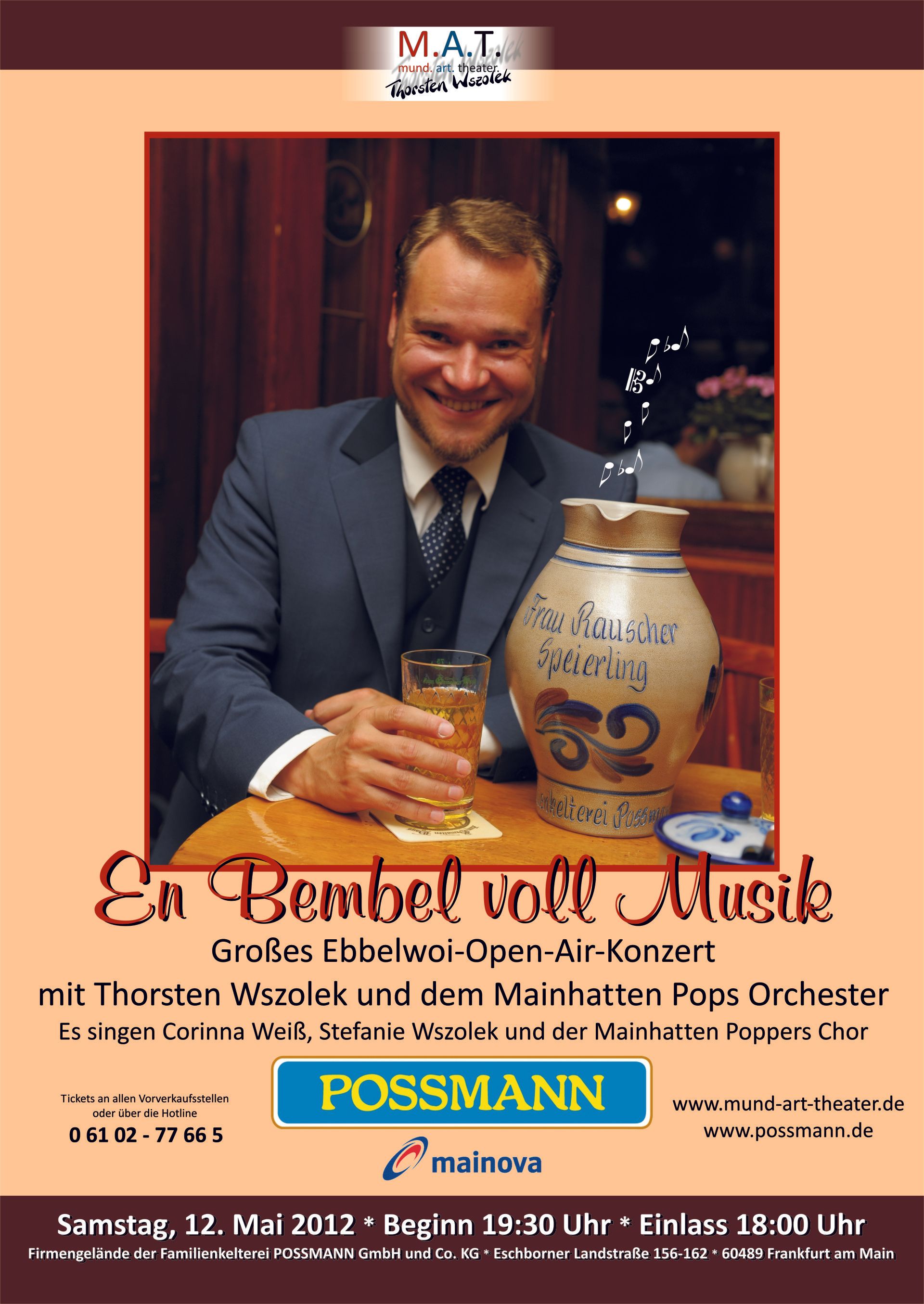 Eine neue Tradition wird erschaffen. Mit EN BEMBEL VOLL MUSIK startet das Mainhatten Pops Orchester eine neue Reihe zusammen mit der Familienkelterei Possmann GmbH und Co. KG, die auf deren Firmengelände Open Air stattfindet und auf einen Schlag vom Publikum sensationell aufgenommen wird.