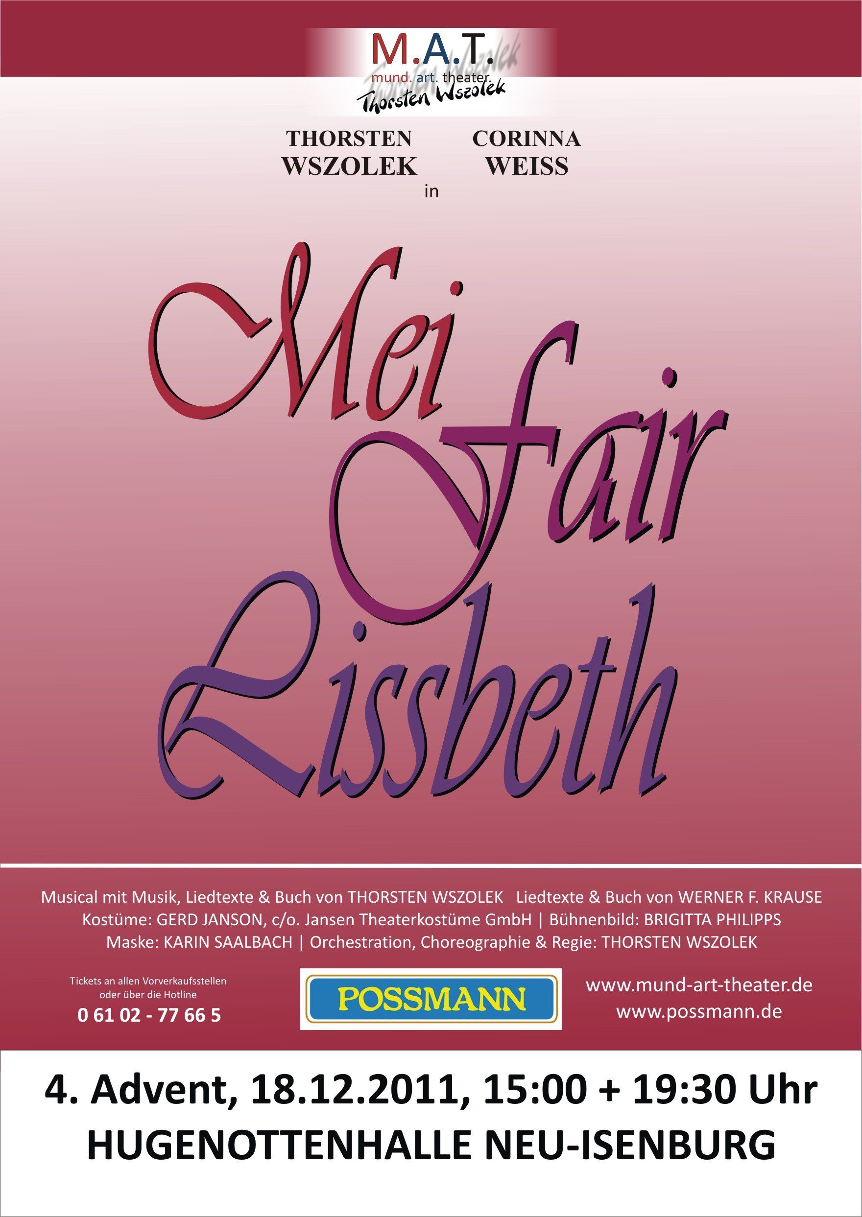 Nach CRAZY HOTEL im Jahr 1995 war bereits 1996 das zweite Musical, das das Mund Art Theater eigenständig entwickelte der Dauerbrenner MEI FAIR LISSBETH. Zu erfolgreichen Revivals und Tournee kam es mehrfach. Nun hat das M.A.T. eine Art Abschied damit gefeiert. Abschied nicht von seinem Musical, sondern Abschied der Dauer-Hauptdarstellerin Corinna Weiß in der Titelrolle und M.A.T.-Veteran Werner Krause, der in allen Produktionen den Lissbeth-Vater Werner Schaffnix verkörperte und u.a. für Liedtexte und Buch verantwortlich zeichnete.