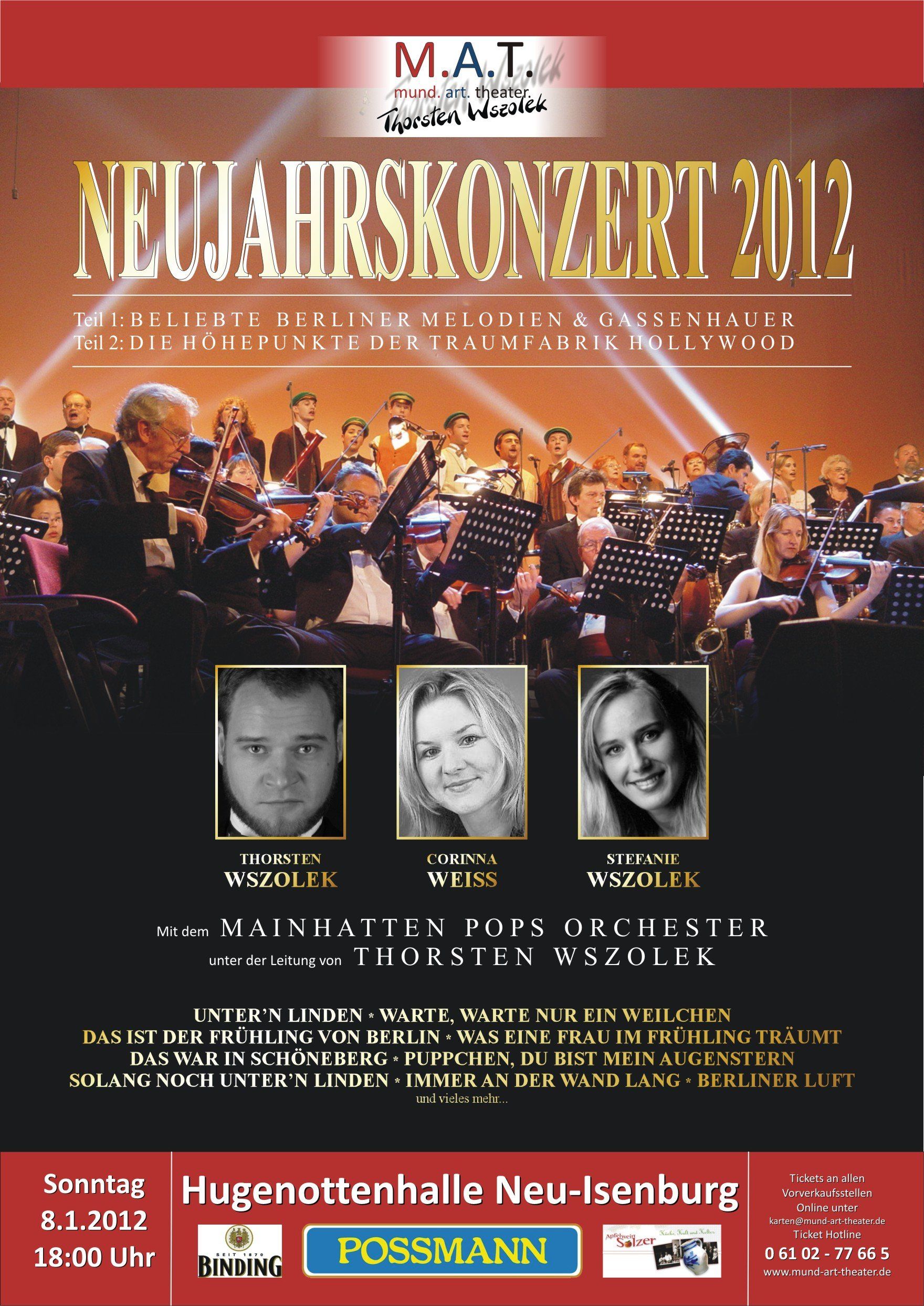 Das NEUJAHRSKONZERT 2012 präsentiert beliebte Berliner Melodien und Gassenhauer, maßgeblich von Paul Lincke und Walter oder Willi Kollo, die das Publikum mehrfach zum Mitklatschen und Mitsingen animieren. Thorsten Wszolek kramt aus einem Archiv den Song von Curt Flatow "Es gibt nur ein Berlin" aus, der anlässlich der 750-Jahrfeier von Berlin von Günter Pfitzmann und den Schöneberger Sängerknaben gesungen wurde und dann leider in der Versenkung verschwand.
