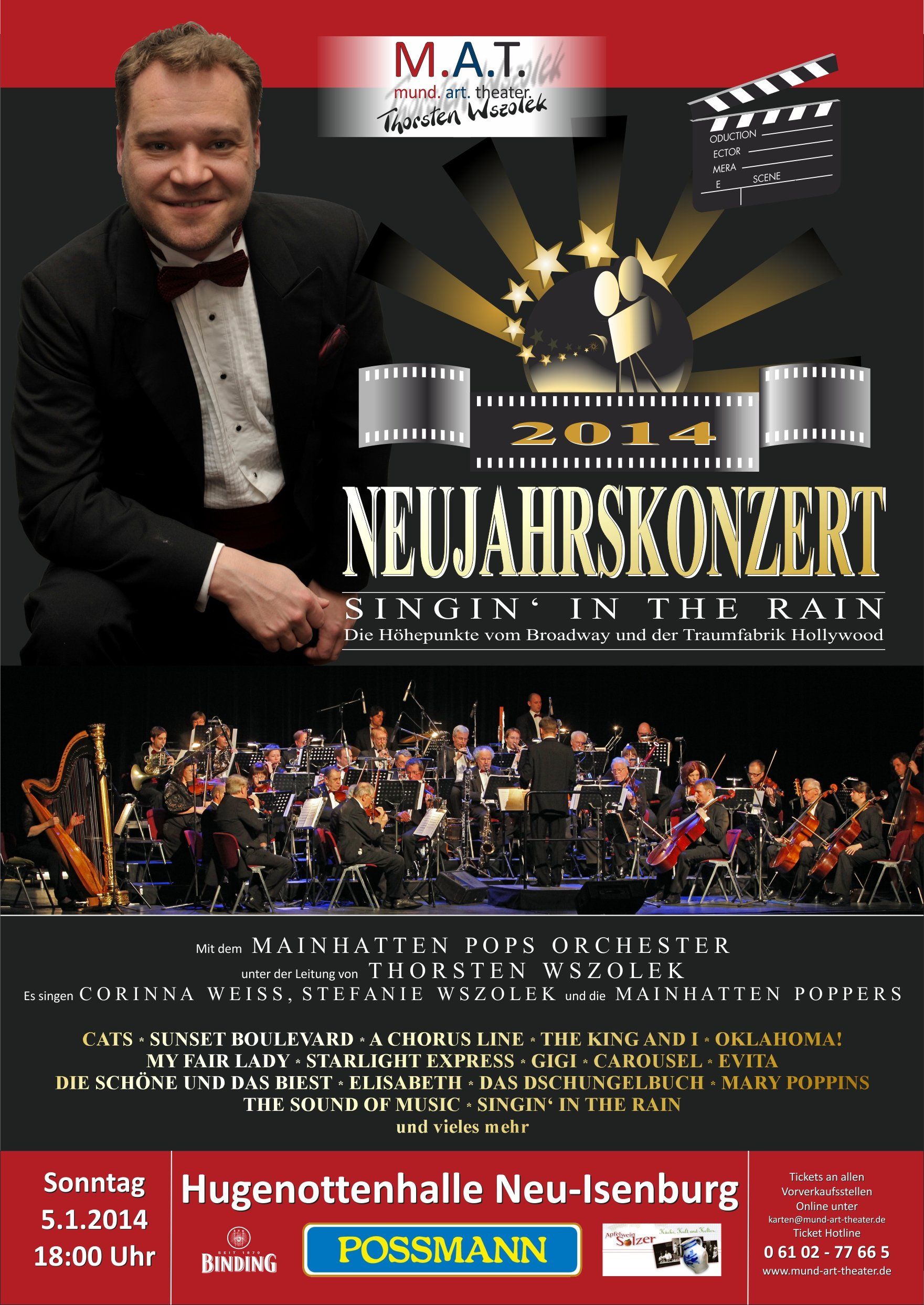 Das NEUJAHRSKONZERT 2014 zeigt Highlights dieser Epoche, wie "Sunset Boulevard" oder "Die Schöne und das Biest" von Walt Disney. Darüber hinaus widmen sich Macher Thorsten Wszolek und sein Mainhatten Pops Orchester den Werken aus früheren Tagen, wie "Oklahoma!", "Gigi", "Singin' In The Rain" oder "Camelot". Große Beachtung beim Publikum findet die Ouvertüre des französischen Film-Musicals "Die Regenschirme von Cherbourg" aus der Feder des großen Michael Legrand.